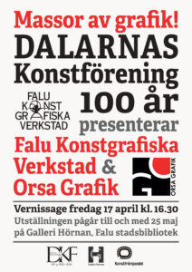 Grafikutställning fredag 17 april kl. 16:30 med 23 konstnärer från Falu Konstgrafiska Verkstad och Orsa Grafik på Galleri Hörnan.